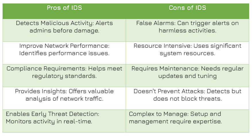 - Hence in such way, IDS helps in early detection of threats, facilitating faster response and minimizing potential harm to the organization.