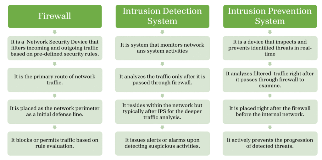 IDS works in conjunction with firewalls and IPS where 3 of them forms a complementary layers of network defense.